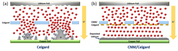 Image (Turchanin et al./Wiley): a) Regular battery separators with microscale porosity cause non-uniform lithium transport during the battery charge-discharge cycles resulting in needle-like growth of metallic lithium. This leads to short circuits and premature failure of lithium metal batteries. b) By introducing a carbon nanomembrane on the regular battery separator, the growth of lithium needles can be suppressed. The sub-nanometer-sized pores in carbon nanomembranes regulate the transport of lithium ions during the battery charge-discharge cycles, resulting in the deposition of a smooth film and the battery life can be increased significantly.