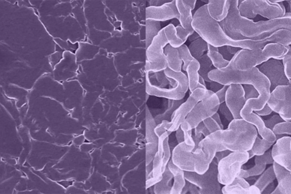 Image: Scientists at the University of Texas at Austin have developed a new sodium metal anode for rechargeable batteries (left) that resists the formation of dendrites, a common problem with standard sodium metal anodes (right) that can lead to shorting and fires. Images were taken with a scanning electron microscope. Image credit: Yixian Wang/University of Texas at Austin.